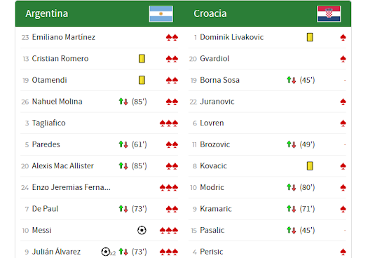 N. Vlašić (45', M. Pašalić), M. Oršić (45', B. Sosa), B. Petković (49', M. Brozović), Lisandro Martínez (61', L. Paredes), M. Livaja (71', A. Kramarić), P. Dybala (73', J. Álvarez), E. Palacios (73', R. De Paul), L. Majer (80', L. Modrić), Á. Correa (85', A. Mac Allister), J. Foyth (85', N. Molina)